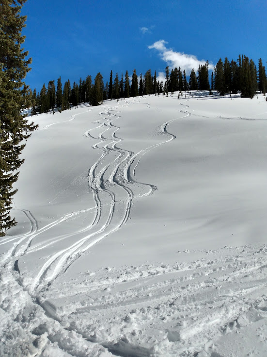 We poked through some scraggy trees, being careful not to cross anything connected to Aetna’s run out, and eventually traversed some terrain to a mediocre glade. I can’t say the payout justified the price, but still I wouldn’t say the time was wasted.