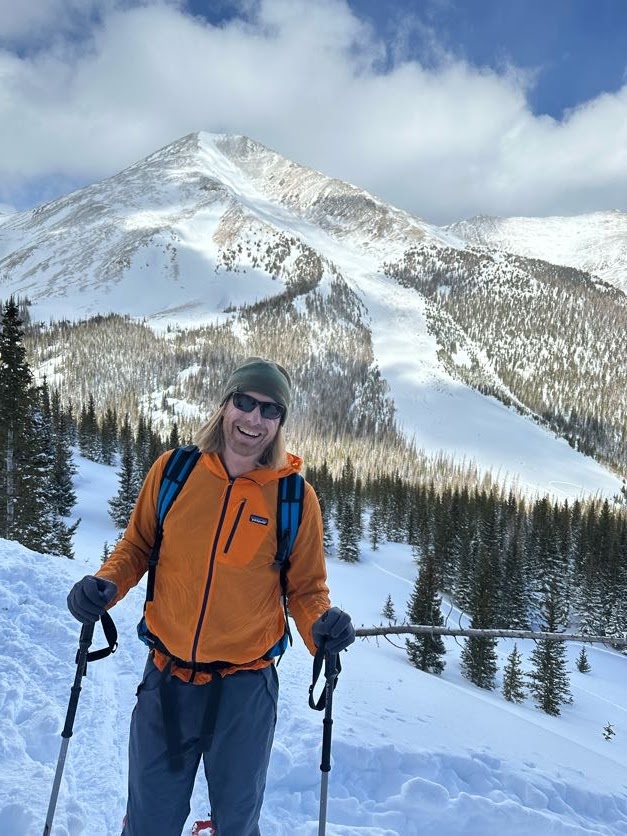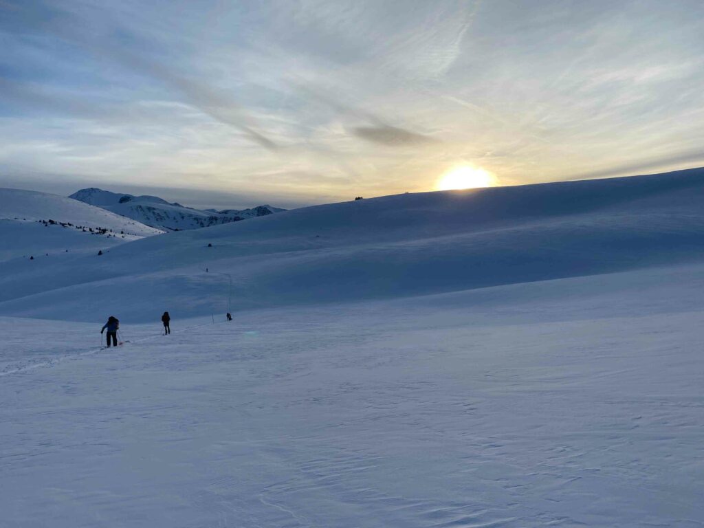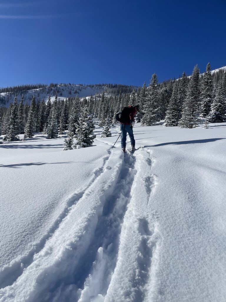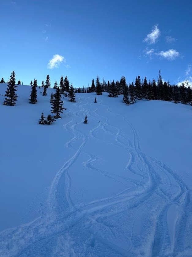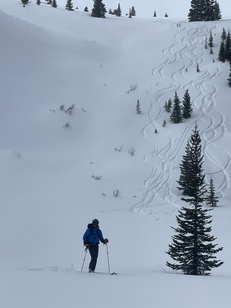 That night, another 6 inches fell, covering most of our tracks. So, the next morning, we again hit the initial spot, though this time skiing a ridge slightly further south. It yielded some good turns, although including a few rocks for me. I guess there is no better way to break in some new skis. As they say in the Midwest, “the rocks come with the farm.” In other words, backcountry skiing is unpredictable, including sections of shallow snowpack.